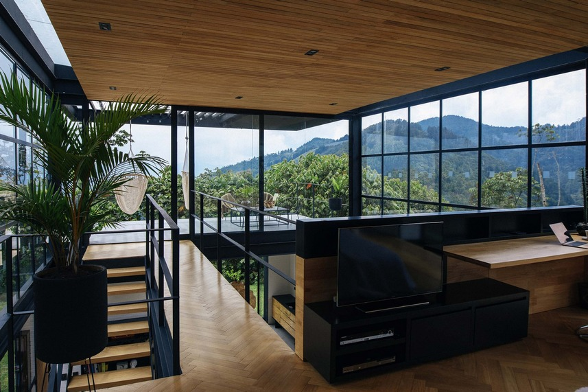 穿過(guò)*空隙的小型金屬結(jié)構(gòu)橋?qū)⑴P室與一個(gè)帶頂棚的露臺(tái)連接起來(lái),露臺(tái)占據(jù)了周圍的自然景觀。
