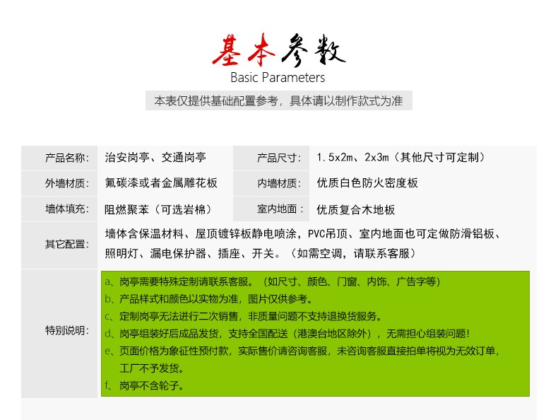 外表面:優(yōu)質(zhì)浮雕飾面金屬板,底座:鋼龍骨架40*40*2.0(厚),中層:18mm防水模板,地板:3mm防滑耐磨鋁地板,門:定制鋼結(jié)構(gòu)門
