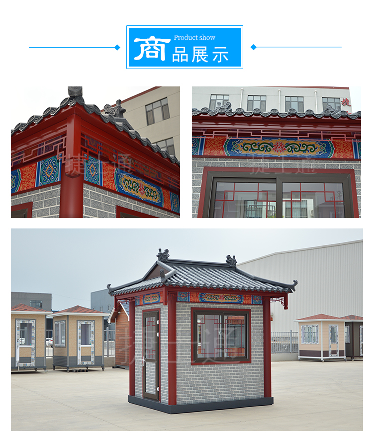 特有的造型,仿古的花紋,創(chuàng)意的窗飾,與古建筑恰到好處的融合,仿古的景區(qū)、仿古的公園、仿古的景點,保安崗亭、售票亭、休息亭均可采用此類風格,而且在設計的時候,尺寸均可定制?。。?!運輸怎么解決?捷士通廠家和全國的物流均有合作,所以只要您在中國,均可運輸?shù)剑。?br />